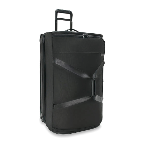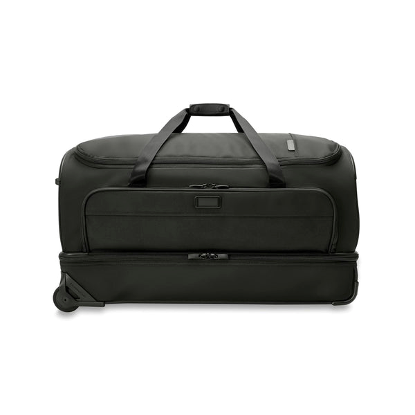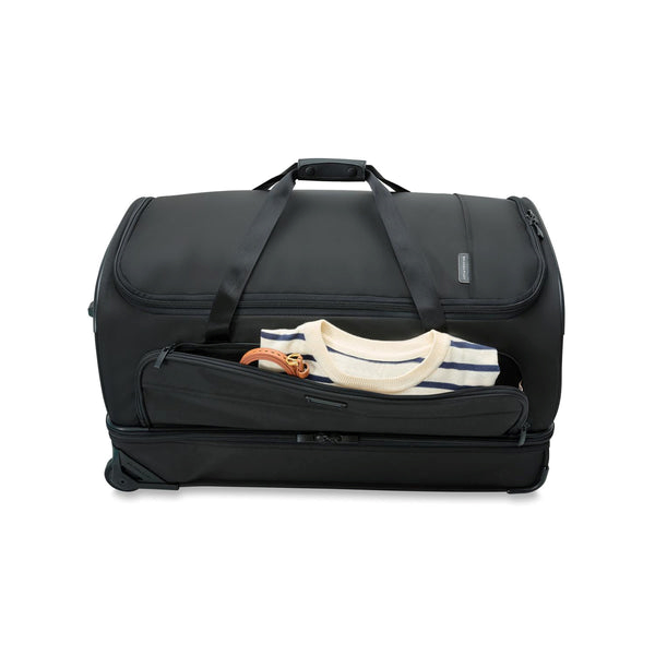 La section de rangement plate s’ouvre au bas du sac pour une utilisation comme sac à roulettes de grande capacité.