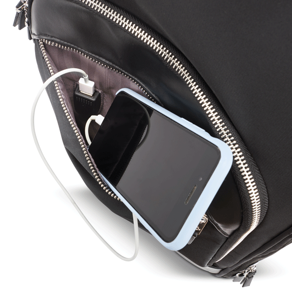 Le centre d’alimentation spécial comprend un port USB et une pochette d’une taille convenant à la recharge sans fil*. * Batterie non incluse