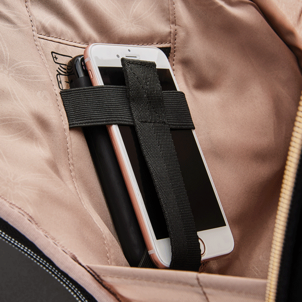 Le centre d’alimentation spécial comprend un port USB et une pochette d’une taille convenant à la recharge sans fil*. * Batterie non incluse